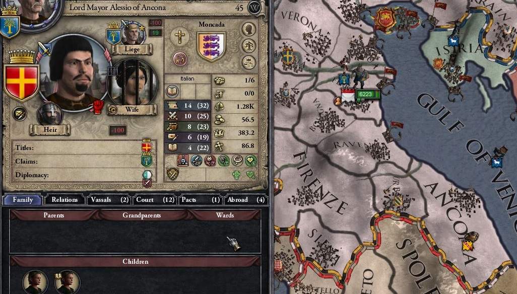 まずは嫁選びだ。幸い初期状態で4歳の跡取り息子がおり、娘も年子で3人と、政略結婚のタネには全く困らないため、 グリエルモの配偶者は、若さと能力重視で選ぶことができる。