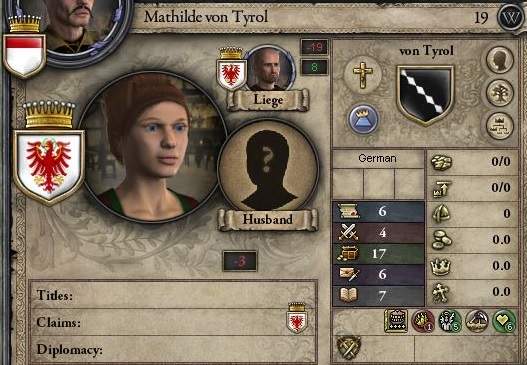 どうせなら「強健」か「天才」持ちの嫁を迎えたかったが、さすがに初期配置でそんな都合のいい存在はいないらしく、リストに見当たらない。 そこで、ご近所のチロル伯国の息女、19歳で「色欲」「ミデアの手」かつ管理17の嫁を貰ってくることにする。