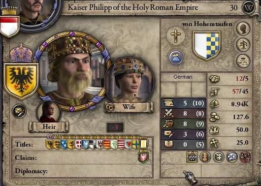 シナリオ開始時点で、HRE皇帝は直臣・直轄地共に多すぎで溢れかえっている状態であ り、1年もしないうちに国内の公爵の勢力図はある程度入れ替わる。