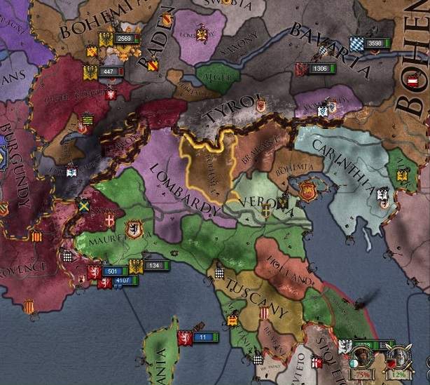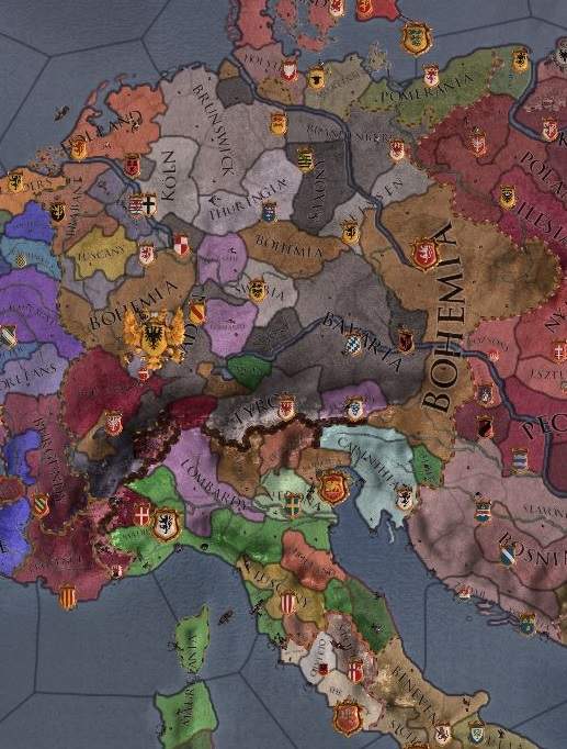 ボヘミア王家が凄いことになっている。 ボヘミア王位に加え、モラヴィア公を直轄、上ロレーヌ公・オーストリア公を臣下とし、 イタリアの教会領やトレヴィーゾ自由市なども抑えている。文句なしに、モーリタニア王に次ぐ帝国第二の領主となっていた。