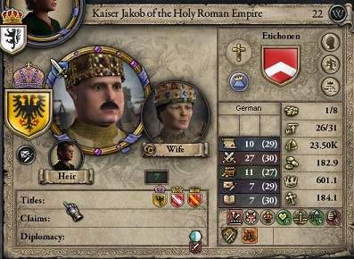 Etichonen*1家のヤーコブ帝。武勇27を誇る大怪獣である。 皇帝即位前は、公位こそ持つものの、直轄1領・封臣の伯1名という弱小家であり、 何というか、皇帝位を力のある家門に渡したくない諸侯の思惑が生んだ皇帝か・・・と思わざるを得ない。