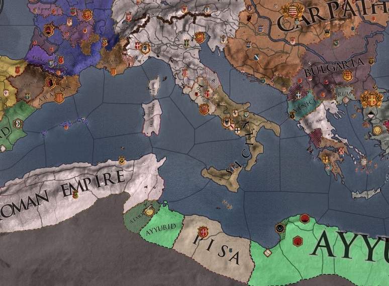 ピサが持っている拠点はキレナイカのあそこだけ。この後しばらくしてアイユーブに攻め落とされ、ピサは一旦消滅する。 シチリア・カルパチアは安定。ブルガリアはこれが最大版図で、ここからジリジリと削られていく。
