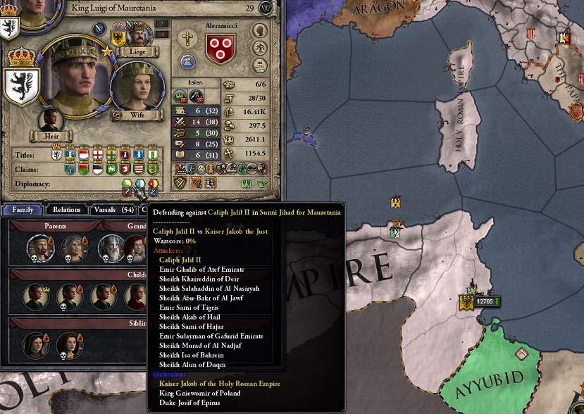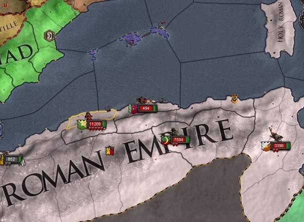 4領を一挙に奪い去り、ヴェネチアに致命傷に近いダメージを与えた。この後、ヴェネチアの軍事行動は一気に鳴りを潜めることになる。 これでまた封臣上限が溢れたため、今度はチュニジア公を作成。5スロットの直轄領チュニスを除いて公に管轄を移した。
