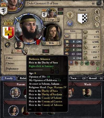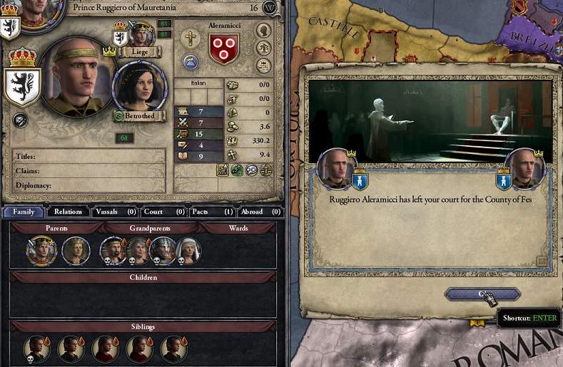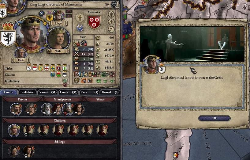 これで、ルジェーロの子供はトレムセン公位に加え、妻の上ブルグンド公、 さらに妻がいずれ継承するはずのスーザ・サルデーニャ両公位、合計4つの公位を継承することに。めでたいめでたい。