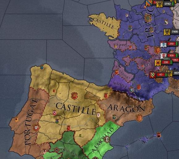 ブルターニュ公、カスティリャ王が丸々継承。思わず「おおぅ」と声が漏れた。 カスティリャはレオン王国と言いブルターニュ公国と言い、レコンキスタでは目立たないが、大きな継承で国土を広げている。