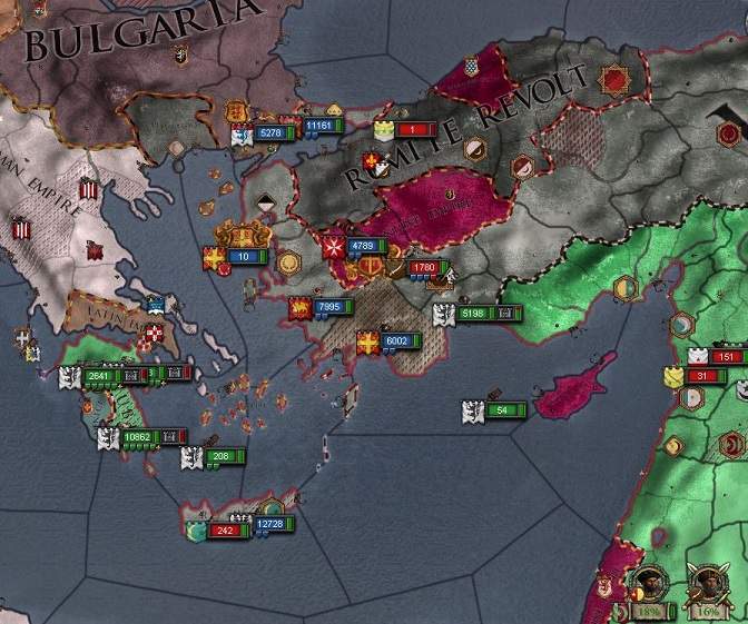 ちょっとSSが残っておらず、いつ奪われたかははっきりしないのだが、 この頃、ラテン帝国アカイア公領だったペロポネソス半島は、アイユーブの聖戦によって奪取されており、 モーリタニア軍はまずペロポネソス半島に展開して確実に戦勝点を稼ぎ、チュートン騎士団のみアナトリアに派遣している。