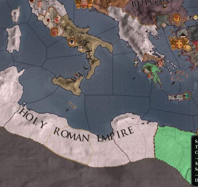 目標はトリポリタニア。ピサがアイユーブに追い出され、全域がアイユーブ領になっている所だ。 いくら皇帝陛下といえどもあの二国を同時に敵に回すのはキツイだろう・・・ 皇帝が領土増やす手伝いするのもアホらしいし、様子見に徹するのが吉だな・・・と思っていたその時。