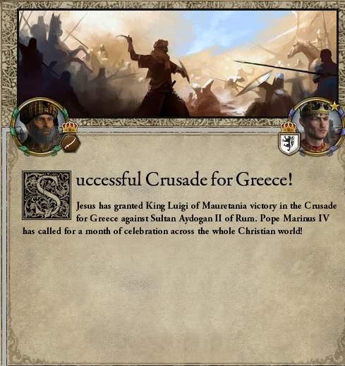 史上最大の十字軍は、迎撃に出てきたイスラム軍25000を文字通り一蹴、暴力的な物量で各地を速やかに占領し、完勝を掲げた。 戦功第一としてギリシャ王座を神に認められたのは・・・