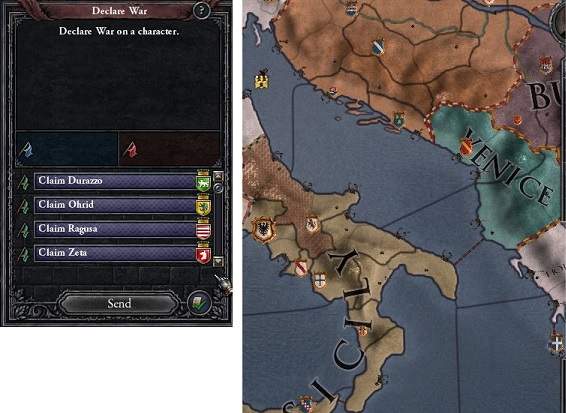 上SSのルイージが持つ請求権の数を見ていただきたい。何かせっせと偽造して作り溜めているのが見て取れると思う。 そう、アドリア海の女王ことヴェネチアがせっせと広げてきた、クロアチア南部あたりの彼奴等の領域全てに対し、我が王の請求権の捏造が完了したのである。