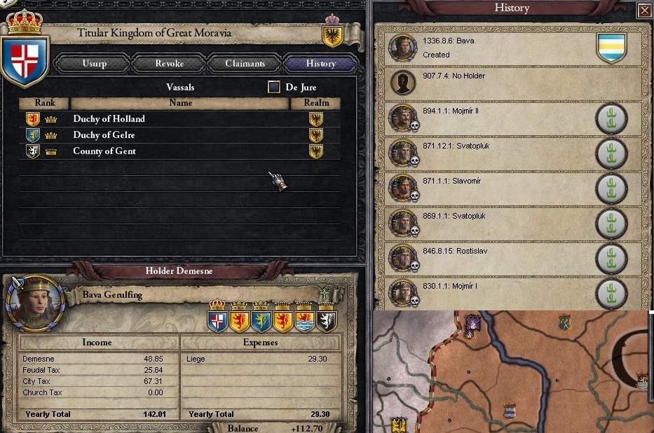 ・・・さて、ここで上のSS左下側の、同盟者の欄を少し見ていただきたい。 Queen of Great Moravia とかいう見慣れない王がいるのが分かるだろうか。