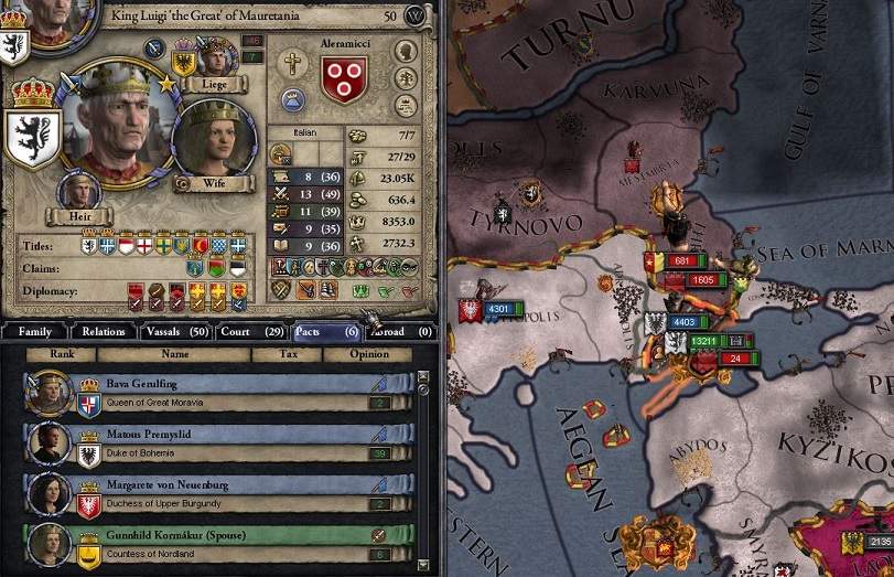 アナトリア方面ではほとんど活躍できていなかったのだが、ペロポネソス半島の占領点がこっちにも効いていたのだろうか? まあ終わり良ければすべて良し。ギリシャ王位と広大な新領土を確保することに成功し、万々歳である。 この後、溢れかえった直轄領の始末のため、大司教領1つ、公爵2つを新設。 モーリタニアやチュニスに持っていた5スロット直轄領は手放して、 コンスタンチノープルと、その周辺にある5スロット領を新たに直轄することとした。 直轄領はギリシャに3(コンスタンチノープル・ニコメディア・スミルナ)イタリアに3(ジェノバ・モンフェラート・モデナ)の合計6領となっている。