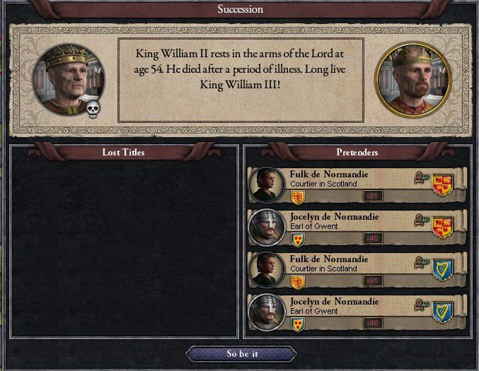 ウェールズ王ウィリアム2世 闘病の果てに54才で没する 十字軍での活躍の他、内政に力を入れた事などから「公正王」を異名を取る 婚姻政策によりブリタニア帝国にまた一歩近づく事となる