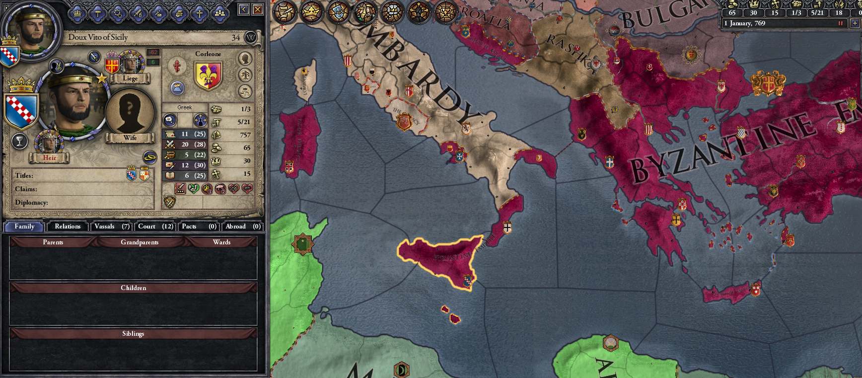 環境†難易度: Hard(フェアプレイのNormalが好きですが初めての難易度アップ) 開始年: 769年 家: コルネオーネ家 宗教:Iconoclast version:2.8.1 DLC:2017/12/12のすべて Mod ・Cadet Dynasty Tool ・Faiterials Buildings ・Group Education ・Your Personal Castle 設定 スーパーナチュラルOFF (そんな怪現象は俺は見たことない) 安全逃亡OFF (安全に逃げれるはずがない) 防衛協定OFF (お前と手を組んだ覚えはない) アステカON (来るなら来い、でも1300年くらいなので見ることはない)