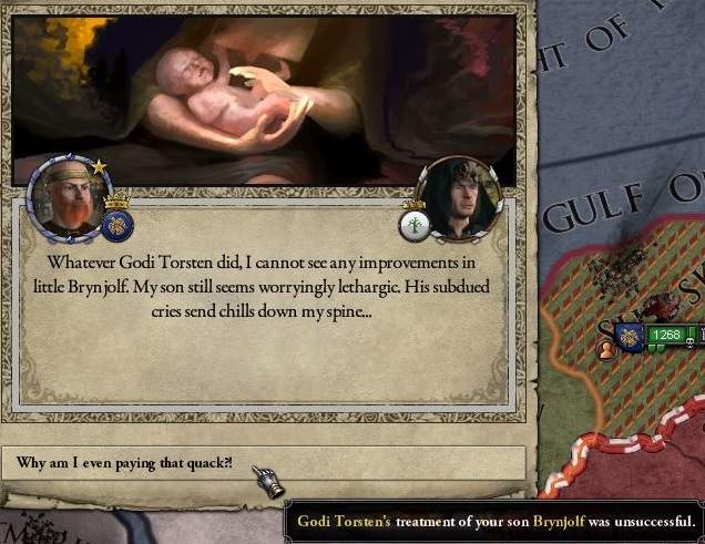 宮廷医師にか弱い息子を何とかしてくれと頼むイベントが発生した。 下の「強いものだけが生き残るのだ」を選んでも良かったが、初のイベントなので上の選択肢で何が起こるのか見てみる。と。