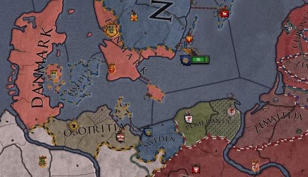 バルト南岸、スラブ教徒のポメラニア公国に宣戦する。 コンクエストCBを海の向こうにも使えるというバイキングの特性は、一神教が相手の場合だけで、 多神教が相手の場合は、海越えでは服属CBか属国化CBしか使えない。 服属CBでポメラニア公号を奪い、後にシチェチン伯を剥奪、とするのも考えたのだが、 分割相続である以上複数の公号を持ちたくないことから、請求権捏造でのピンポイント攻撃とした。