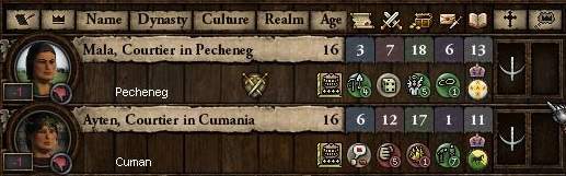 正妻には「貞節」かつ管理18を誇るテングリ教徒のペチェネグ人を選んだ。 が、この1人だけでは男子が産まれてくれるか不安なので、「好色」かつ「ミダスの手」持ちのクメン人女性を側室とする。