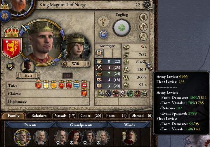 1070年、ハーラル王がガンで死んだ時点で、ノルウェー軍は6500まで減じていた。 ノルウェーはクソ貧乏なので、イベント兵さえ消耗してくれれば自前の戦力は3000ソコソコ、どうとでもなる範囲に留まる。 もう少し、どこかで減らしてくれればいいのだが。