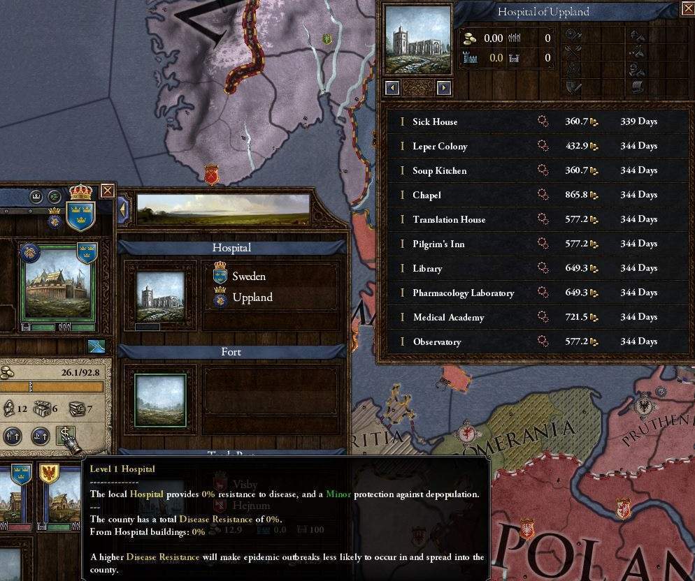 が、病院をただ建てるだけでは何の効果ももたらさないようだ。疫病抵抗力が0%から動いていない。 病院に色々な施設を整備していって初めて、疫病に対処する能力が増していくようになっているようだ。 疫病対策のみでなく、技術開発速度を上げたり、君主の権威や信仰にボーナスを与える建物も含まれている。 また、建築技術に応じて、建てられるものの種類が増える。建築技術『1』の現状では、なにも建てることができない。