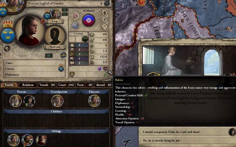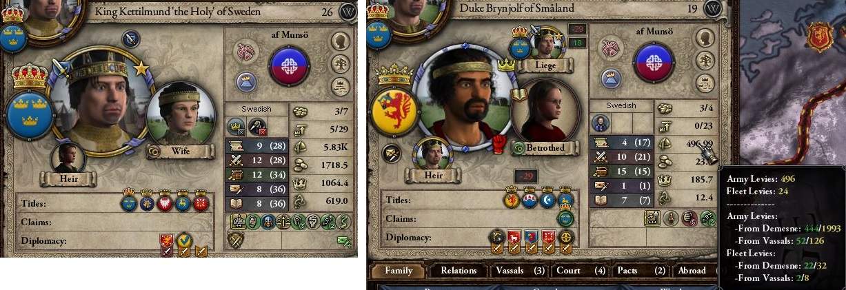 飛びぬけたものは無いがバランスの取れた能力値であり、特に悪い特性も無い、とまあまあ合格点の君主と言える。 略奪祭りのおかげで資金も莫大に溜まっている。この資金は、ウプランド・シェランへの都市建設や城塞設備の改善にちょっとずつ使っている。 保有している直轄領はウプランドと、予定通り王の即位後すぐに継承できたシェラン、あと一カ所はどこだか忘れた。