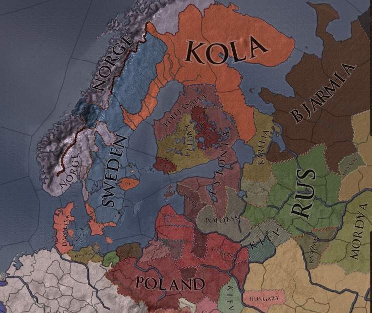 スウェーデンはdejure域のほぼすべてを回復。一部にゲルマンの大部族、コラ大族長の領土があるのみだ。 この頃バルト沿岸地域では、OSOTRITIA公国がポメラニア公国を征服。これによって、ポメラニア王を名乗っている、 が、ポメラニア公の領域はポーランド王の聖戦によって奪われ、さらにHRE皇帝の親征を受けて、カトリックへの改宗を余儀なくされている。 これでスラブ教を信ずる勢力は掃滅されたことになる。