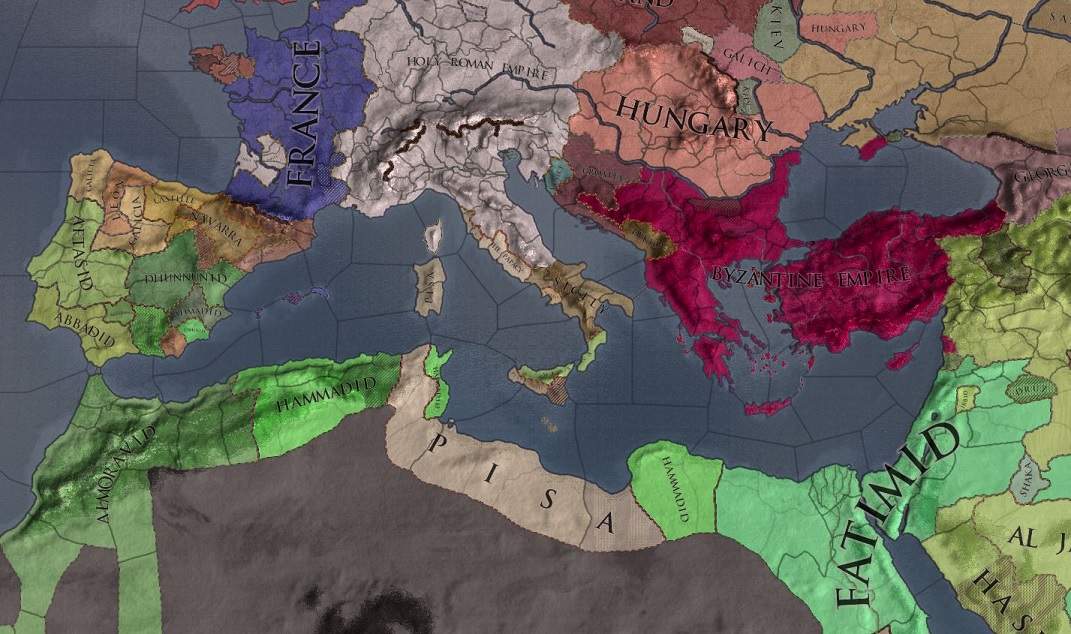 HREはド安定の超大国。フランスのアキテーヌ公領が継承で帝国領になっている。 ハンガリー・ポーランドも東欧で安定した体制を築いており、東方へジワジワと侵食している。 ビザンツ帝国は流石の千年帝国である。東でセルジュークと戦う一方、西ではクロアチアを着々と消滅に追いやりつつある。 イベリア半島はグッチャグチャ。レオン・ガリシア・カスティーリャ・ナヴァラ・アラゴンと、カトリックの諸王国・公国が居並び、 一方タイファ諸国も中小勢力が乱立と、半島全域が混沌に包まれている。 モーリタニアをほぼ統一した大国・ムラービト朝がこの地域のカギを握っているだろう。