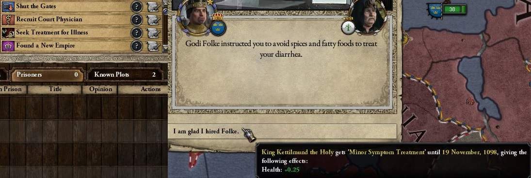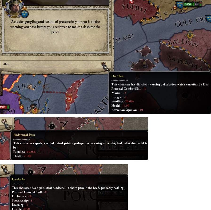 が・・・軍が精力的に活動を続けている中、ウプランドの王宮では王が病魔の嵐に晒されていた。 96年8月、まず下痢の症状が。次いで9月に腹痛、10月に頭痛が発生。(合計健康値マイナス2.5)