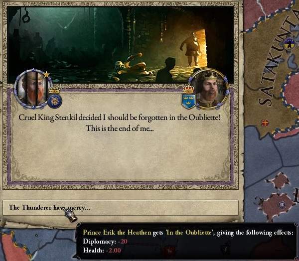 としている。 宰相に、スウェーデン王との関係改善をさせているのは気休めのようなものだが、オピニオンが高ければ捕まりにくい? ような気がするからだ。 通常、王位簒奪を狙うなら、私戦で王の直臣を食い荒らし、国内で勢力を広げていくのが定石であると思う。 が、ver2.52のころに何度か試行錯誤した経験だと、ゲルマン信仰のウプランド公がスウェーデン王臣に私戦を宣戦した場合、 100%間違いなく即座に牢獄行きにされ一生出してもらえなかった。