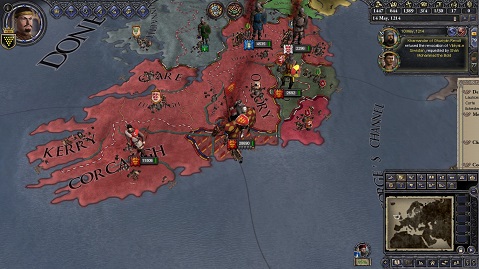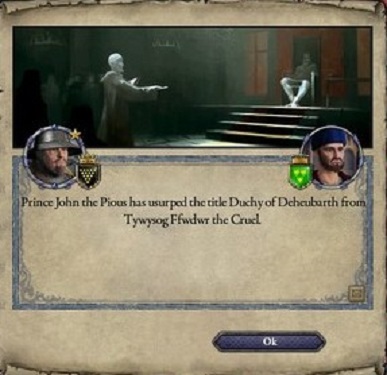 強大な王軍にかなうはずもなく、オッソリー公は敗れて公位を剥奪、デボン伯に降格となります。 そんなデボン伯を哀れみ後見人を買って出たのが我らがジョンでした。デボン伯はいたく感激したそうです。 以後デボン伯はジョンのもっとも忠実な封臣として大いに活躍するのです。