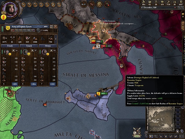 ヴァイキングの連帯の強固さに救われ、度重なる戦勝に浮かれたシチリア公は内乱中のビザンツに目を付けた。 この時のビザンツの動員兵力は9000ほどであり、援軍を受けて、傭兵を雇えばひっくり返せない差ではない。 時の当主、シチリア公タンクレードはビザンツに宣戦布告する。