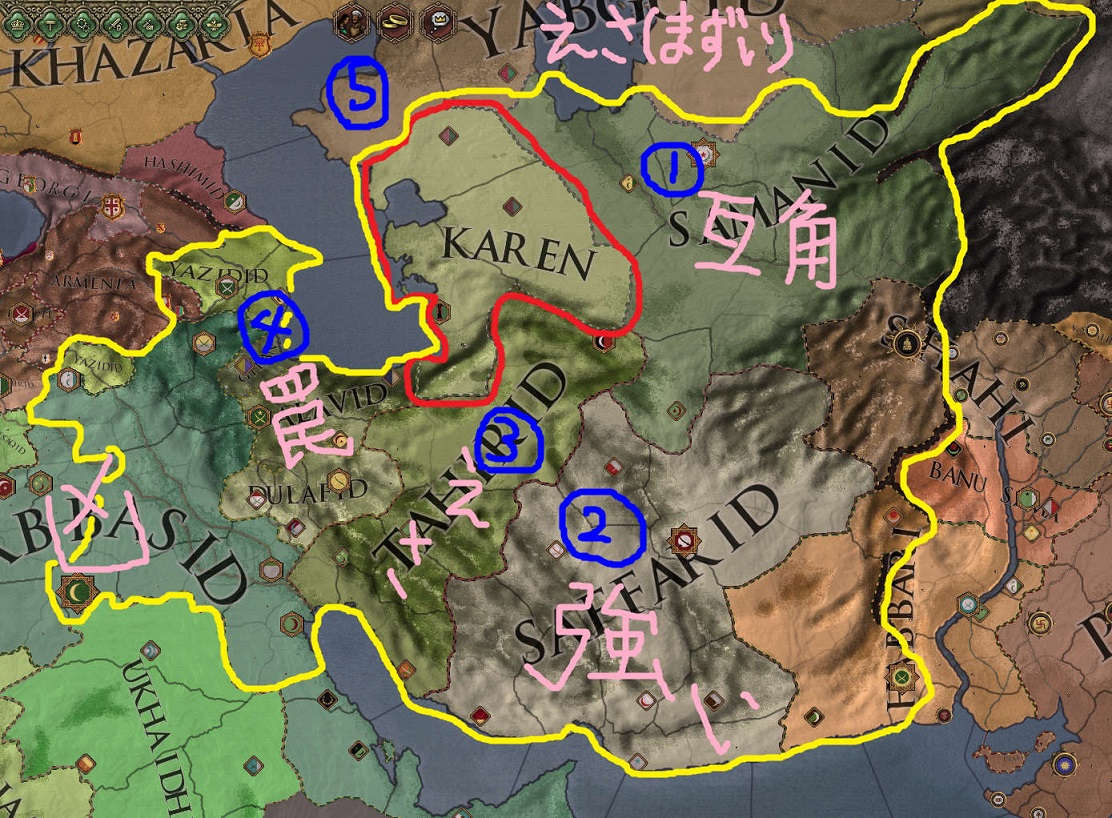 アッバース朝の動員力とサッファール朝の史実補正が強力であるため、カレン家戦略の基本の一つは北の遊牧民⑤を食っていって力を蓄えることです。 聖戦CBは公爵領単位でしか奪われないため、食われるよりも多くを北から奪うということです。 ユダヤのハザールと似たような発想かもしれませんね。