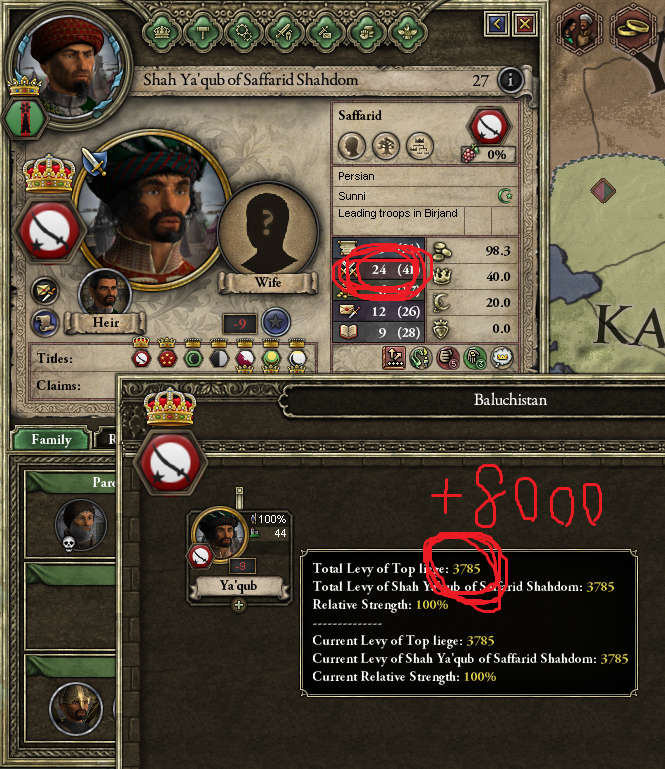 上記のように彼は史実での活躍から、武力のみ固定の24である上にイベント兵力として維持費無しの8000人が追加で与えられています。 一応、我がカレン家にも当主の初期武力依存で3000~4000程度のイベント兵があるのですが、それでも総動員で6000程度、傭兵を足しても8000~9000が限界です。 サーマーン朝と遊んでいる間に、史実でもやられ役であった③のターヒル朝が、大体にして開幕宣戦されて食われます。丸ごと食われます。 ターヒル朝は動員兵力1500程度、スンニ派同士なので援軍も無いため、サッファール朝のイベント兵力8000人は対して傷つかずに温存されるのです。 そして併合後、サッファール朝の総兵力は13000程度に肥大しており、サーマーン朝との緒戦を乗り切ったカレン家に矛先が向いた場合には、もはやどうしようもありません。