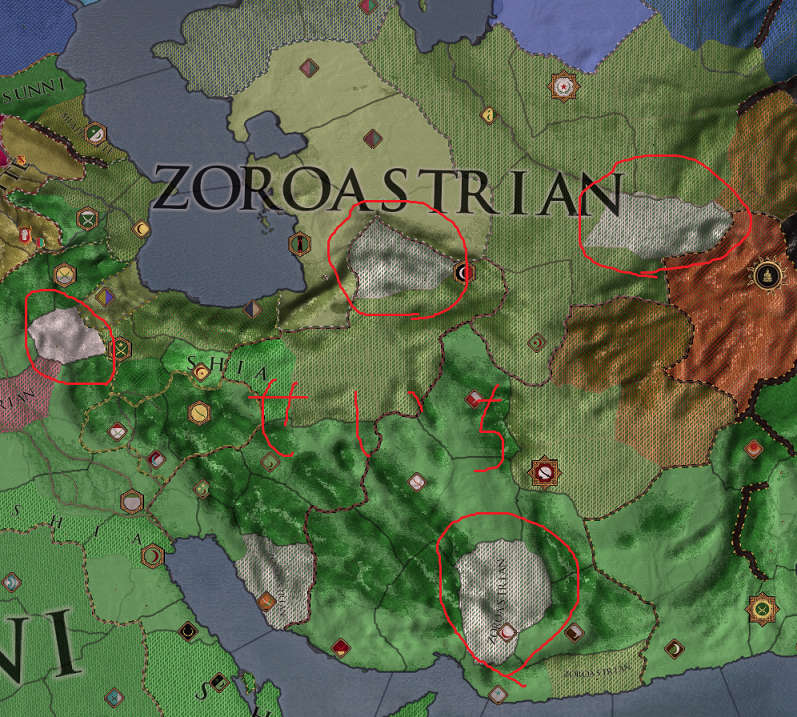 バージョン2.1.6から鉄人モードがやりやすくなりました。 その中で取れる実績に「The One Who Brings Benefit」というものがあります。 これはゾロアスター教徒でペルシア帝国を再興すると解除される実績なのですが、 開始時からゾロアスター教徒のプレイ国家として選択可能なのが、カスピ海東岸に位置するカレン家です。 (一応その配下の伯爵でもプレイはできますが……) しかしこの実績、実質挑戦可能なカレン家の初期立地状況から、それなりに難易度が高いです。 その理由は以下を御覧ください。