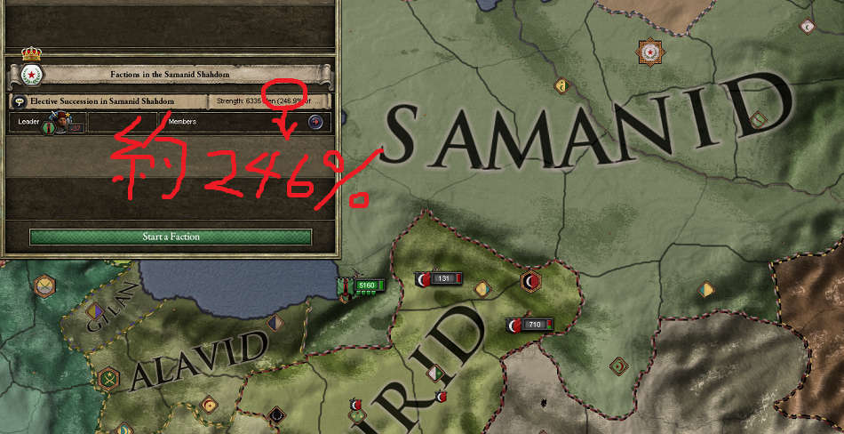 ですが、実はこの時点でカレン家の動員兵力は大して増えていません。簒奪者とみなされているため、サーマーン朝の旧臣は即座に王位返還を求める派閥が確実にできます。 時間経過で上昇する兵士量では派閥側に軍配があがるため、最後通牒を突きつけられるのも時間の問題でしか無いのです。