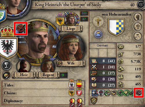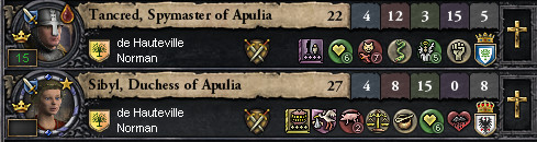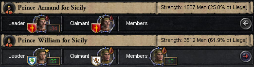 プッリャ公シビル: さっそくアルマン卿を王位に推す派閥に入ったわ。 …って、あなたは派閥に入らないの? ベネヴェント公ウィリアム2世: いや、まあ、もう少し情勢を見極めてから…。(Craven)