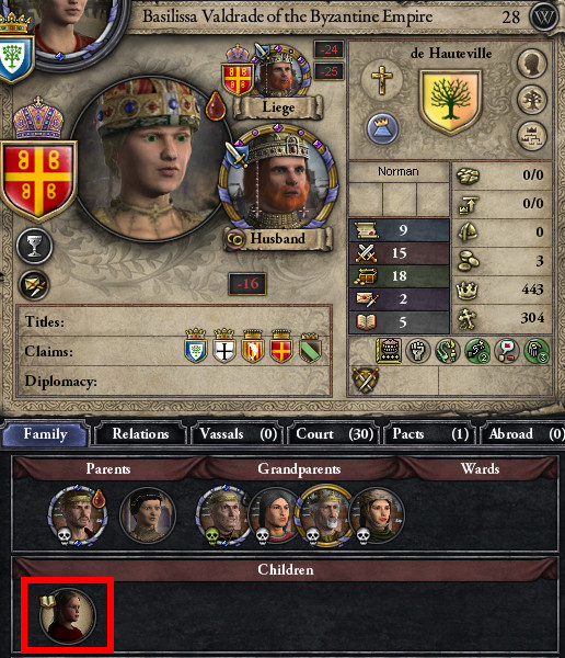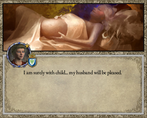 : 二人目を妊娠したわ。 : いいねー。オズバーンを産んだことで弾みがついたのかな? ところで、シチリア王ハインリヒがアイユーブ朝のトリポリタニアへの聖戦を宣言したんだ。 私も指揮官として出征するよ。
