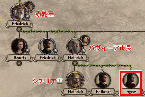 : これは…! : シチリア軍はノルマン人ばかりだ。 憎っくきゲルマン人の王が再起不能になったことで、お祝いしてもいいくらいなんだけど…。 彼も、最後まで勇敢に戦った立派な十字軍戦士だ。 だから、素直に喜ぶことはできない。 そういう空気なのさ…。 : (あなたにも、そのくらいのデリカシーはあったのね…。) それにしても、王には子がなかったはず。 後継は誰が? : 2年前に亡くなったパヴィーア市長ハインリヒが最後に作った4歳の娘、アグネスだよ。