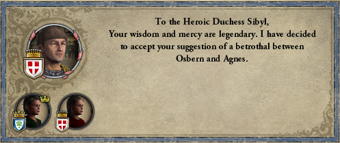 : もしかして…、私たちの息子・オズバーンと結婚させれば、王位をオートヴィル家に取り戻すことができるんじゃない? : ははは、無理だよ。女系結婚じゃないと承諾してくれないだろう。