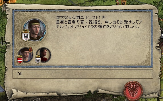 オーストリア公爵エルンスト1世、30才。妻は同い年のアデルヘイト・ウェッティン、妻の父はボヘミア公領の北に位置するラジッツ伯。 夫婦の間には、既に、二男一女をもうけている。