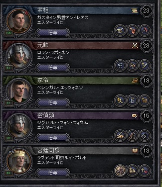 宰相と元帥は変わらず。 ラオフの後の家令にはブルゴーニュ公爵の次男でエッツォネン家のベレンガルを招聘した。40才。 祖母はバベンベルグ家の出身である。 ダチョニィの後の密偵頭は、ローターの父レオポルト1世の頃からバベンベルグ家に仕える フィウム家のジグハルト。48才。 宮廷司祭はラヴァント司祭のルイトポルト。