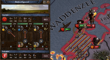 10500対12000、数ではスカンジナヴィアが不利だったが、練度では圧倒していた。8000人以上を生存させる事に成功し、追撃戦となるエグモンドの戦いでは殆ど損害を受ける事もなく敵軍を蹴散らしている。 ゼーラント割譲を強要可能な所まであと一息、と思われたその時……奇妙な戦いが起こる。 余程の混乱だったのか、状況を推し量る詳しい史料は残っていないが、同盟関係に無い筈の西フランク軍約10000が、ギーグ王本人に率いられて中フランクに加勢したというのである*2。この加勢はスカンジナヴィアに対する宣戦布告もなく行われているが、どうもこれは、スウェーデンが東フランクに侵略戦争を仕掛けたのに対して援軍を送る道中、通りすがるついでのつもりで行われた攻撃であった様だ*3。
