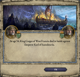 王の首を掲げて勝鬨を上げるヴァイキング達の姿に、西フランク軍は完全に戦意を喪失し、おおわらわで撤退を開始する。 残されたビザンツ・ボヘミア軍は員数を3000を割っており、間もなく壊走となった。 10500の軍で、都合20000以上の敵軍を退けたこの奇跡的勝利を、ノルド達が「聖地の加護」と考えた事は自然であっただろう。