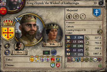 東フランクの西進によって中フランクとイタリアが両断されて、西フランクとアキテーヌに接触している。また、バイエルンが中フランクから分離している。兵力については、バイエルンが3000、アキテーヌが7000、東・中・西フランクはそれぞれ10000程で拮抗していたと考えられている。 これらフランク系の国家は何れもカロリング朝の版図であったが、中フランク(及びバイエルン)は、2代前の女王・アデーレがプラウエン伯・ロスティスラフと結婚した事で、モラヴィア王国に由来する東欧系の血筋であるモイミル朝となっていた。アデーレとロスティスラフの版図は、唯一の息子であったペルリム残酷王に継承されたが、ペルリムの死後、中フランクとイタリア王冠は長男・ズビネックに、バイエルン王冠は次男・ロスティスラフに分割継承されたのである。