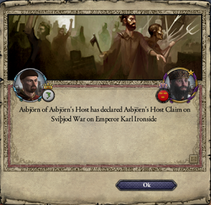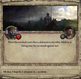 シグルド2世の年下の叔父・アスビョルンが、スヴィドヨッド王冠のムンソへの返還を求める為に兵を募り始めたのである。きっかけは二人の間の口論だったという。 シグルド善王の四男として生まれたアスビョルンは継承順位の低さから領土を得られず、オーランド島のロングハウスで食客として遇されていたが、彼の野心はノルド戦士として財産を得る事にあり、甥に元帥として働かせる様に要求し続けていた。しかし、アスビョルンの脚の障害では激しい戦闘に堪えられる訳もなく、それをシグルドが指摘した事でアスビョルンが激昂したのだ。