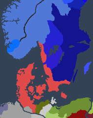 デンマーク統一時のスカンジナヴィア南部及びユラン半島の勢力図(朱色がユラン=デンマーク)。 ノルド・ヴァイキングの祖地として知られるスヴィドヨッド(濃青)と隣接している。