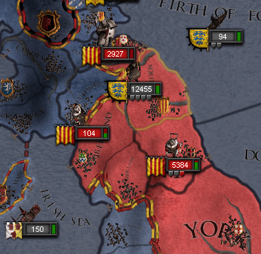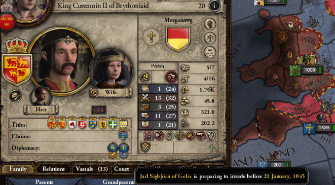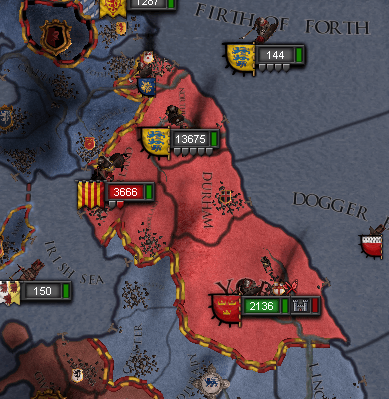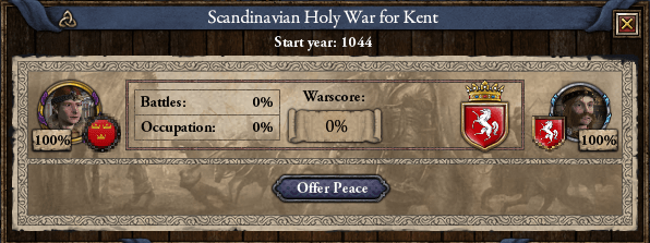 1044年初頭、ケント王国に聖戦を布告したのである。 ケント王・イアン・デ・ギードは周辺国に援軍を要請したが、多くはノーサンブリアに掛かり切りで、応じたのはブレフネ女伯・モールのみであった。