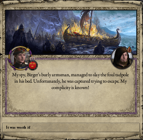皇太子・ビルゲルが、その近衛によって殺害されたのである。 下手人はビルゲルの就寝中に室内に侵入した。運良く目を覚ましたビルゲルであったが、応戦するも幸運は二度続かず、凶刃に掛かったのである。そして、騒音によって集まった家臣に捕らえられた男は、なんと中東から帰還した頃にギュリドによってビルゲルに宛がわれた近衛で、寝所を衛る役目を利用しての犯行だったのである。