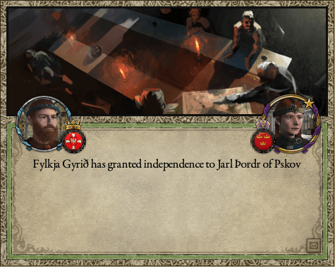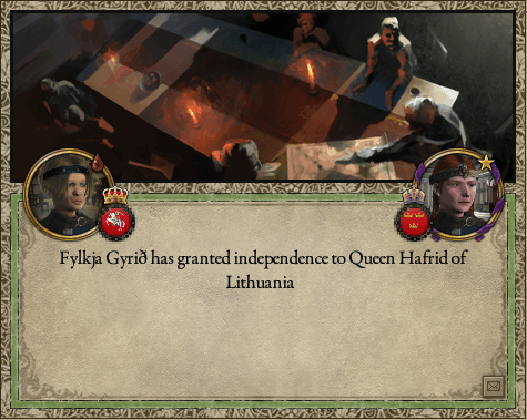 リトアニア女王・フローニ氏族の"フレイの剣"ハフリドら、スカンジナヴィア帝国本土の慣習領土に所領を持たない族長達に、それぞれ独立を認めたのである。