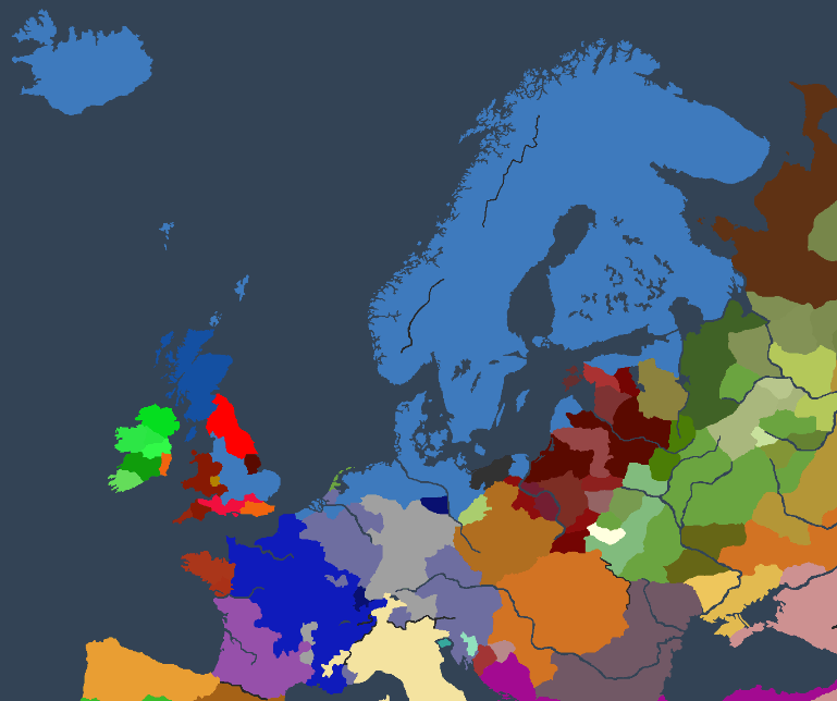 1046年初頭、スカンジナヴィア帝国とその周辺勢力図。東欧~ロシア領域は未だ混沌の様相であるが、フランク諸国は比較的原型を保っている。この時までは。