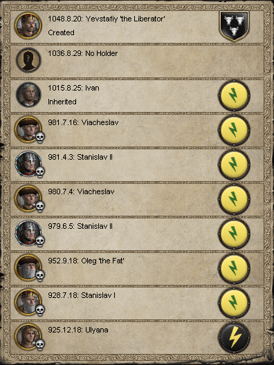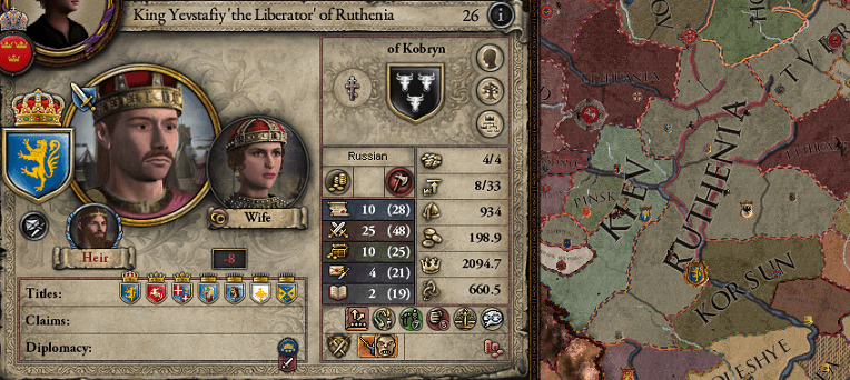 ルテニア王冠はキエフ=ヴィーテブスク女大首長・ウリヤーナによってスラヴ系の多神教国家として創設された後、長子・スタニスワフ1世によってリャコヴィッチ朝が拓かれた。更にその長子・オレグ肥満王へと継承されると、彼の改宗によって正教国となっている。オレグが崩御すると、その後2年程はスタニスワフ2世とその弟・ヴァチェスラフによる継承争いが起こって所在が安定しなかったが、最終的にはヴァチェスラフが勝利して、崩御の後にはその息子・イヴァンに継承された(因みにそのどさくさに紛れてキエフ公領はアールパード朝の"慈悲深き"エレクによって征服されて、独立している……のだが、キエフ伯領は直轄領であった為にルテニア内に残った。ややこしい。)。 イヴァンは、当時まだスカンジナヴィア帝国領だったホルムガルドの大族長・トョルフィ氏族のヘルギ2世の侵略を受けて、1036年に全ての領土を喪失している。この時点でルテニア王位は一度破壊されたのである。 そして、1048年の8月、イェフスタフィはノルドをルテニア領から駆逐した功績からジョージア総主教の戴冠を享けてルテニア王となった。また、この時にジョージア王・エレクレ残酷王の孫娘・レラとの結婚式も行われ、ルテニアの新たな王朝と、バグラチオン家の同盟が締結されたのである。