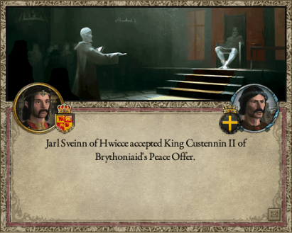 この時、ブリソニア王・クステニン2世はウィッチェ大族長・スヴェンの迎撃に全力を注ぎ、その撃退に成功。獲得した賠償金を投入して傭兵を雇い、同盟国の援軍と合わせて何と1万名を超える兵員を揃え、ノルド勢力をほぼ全て駆逐する事に成功していたのである。